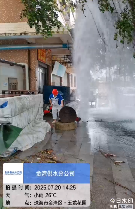 7月20日下午,金灣文華路11號(hào)的消火栓被強(qiáng)風(fēng)刮倒的大樹撞斷,3米高的水柱在狂風(fēng)中噴涌。接到消息后,搶修人員立即穿著被雨水浸透的工作服匆匆趕到,參與搶險(xiǎn)的黃師傅回憶道,“當(dāng)時(shí)風(fēng)雨未停,但看到噴涌的水柱,就顧不上那么多了?!贝舜螕岆U(xiǎn)僅用30分鐘處理完畢,無(wú)用戶受影響,創(chuàng)造了臺(tái)風(fēng)天氣搶修新速度。